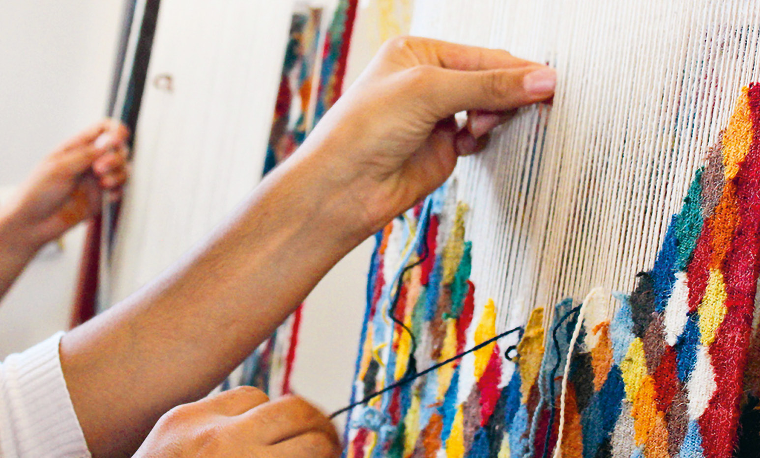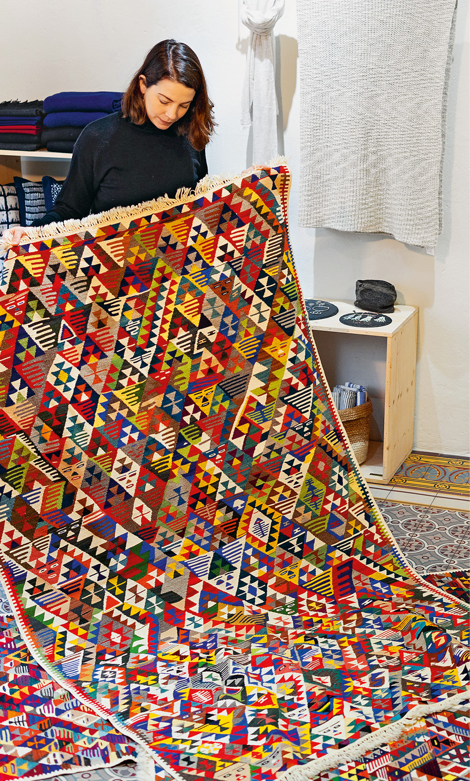 Lisa Jaspers präsentiert einen farbintensiven Kelim-Teppich, den Frauen in Ostanatolien mit regionaler Wolle von Hand knüpfen. Foto: Victoria Kämpfe