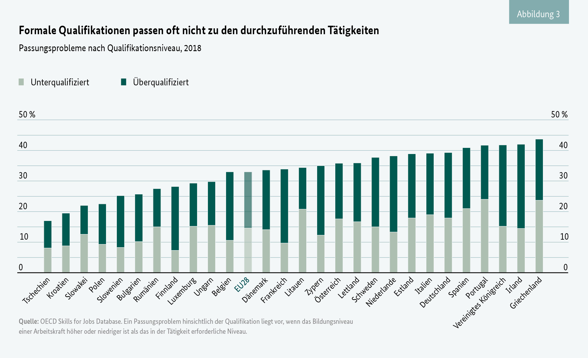 - Passungsprobleme sind ein großes Wachstumshemmnis. Viele Bildungsindikatoren haben sich in den letzten zehn Jahren verbessert. Der Anteil der Schulabbrecher*innen liegt in der EU bei zehn Prozent, vier Prozentpunkte niedriger als im Jahr 2010. Im gleichen Zeitraum ist der Anteil der 30- bis 34-Jährigen gestiegen, die einen tertiären Bildungsabschluss erworben haben: von 33 auf 40 Prozent. Insbesondere Frauen haben ihr Bildungsniveau deutlich verbessert. Das Hauptproblem der formalen Bildung ist nicht per se das Niveau. Als problematisch wird vielmehr die Tatsache angesehen, dass die Qualifikationen oft nicht zu den Tätigkeiten passen, die im Beruf ausgeübt werden. Nach OECD-Angaben ist etwa ein Drittel der Arbeitskräfte in der EU im Alter von 15 bis 64 Jahren entweder über- oder unterqualifiziert (Abbildung 3). Das bedeutet, dass ihre formale Qualifikation höher oder niedriger ist als die üblicherweise bei Arbeitskräften in den jeweiligen Berufen beobachtete Qualifikation.3 Für jüngere Arbeitskräfte im Alter von 15 bis 34 Jahren bestätigt Eurostat, dass im Jahr 2018 bei 28 Prozent ein entsprechendes Passungsproblem vorlag (19 Prozent in Deutschland).4 Insbesondere Überqualifikation stellt mit Blick auf das Wachstumspotenzial einer Wirtschaft ein großes Problem dar, denn dies bedeutet die Verschwendung wertvoller Ressourcen, die entsprechend ihrer Qualifikation produktiver eingesetzt werden könnten.5 Überqualifikation hat in der EU in den letzten zehn Jahren leicht zugenommen. Besonders Frauen, aber auch junge Menschen, Migrant*innen aus Drittländern, sowie Migrant*innen innerhalb der EU, die aus den östlichen EU-Staaten kommen und in einem der westlichen Staaten leben und arbeiten, sind betroffen. Letztere sind im Allgemeinen sehr gut qualifiziert, können daraus jedoch auf dem Arbeitsmarkt der Gastländer kaum Kapital schlagen.