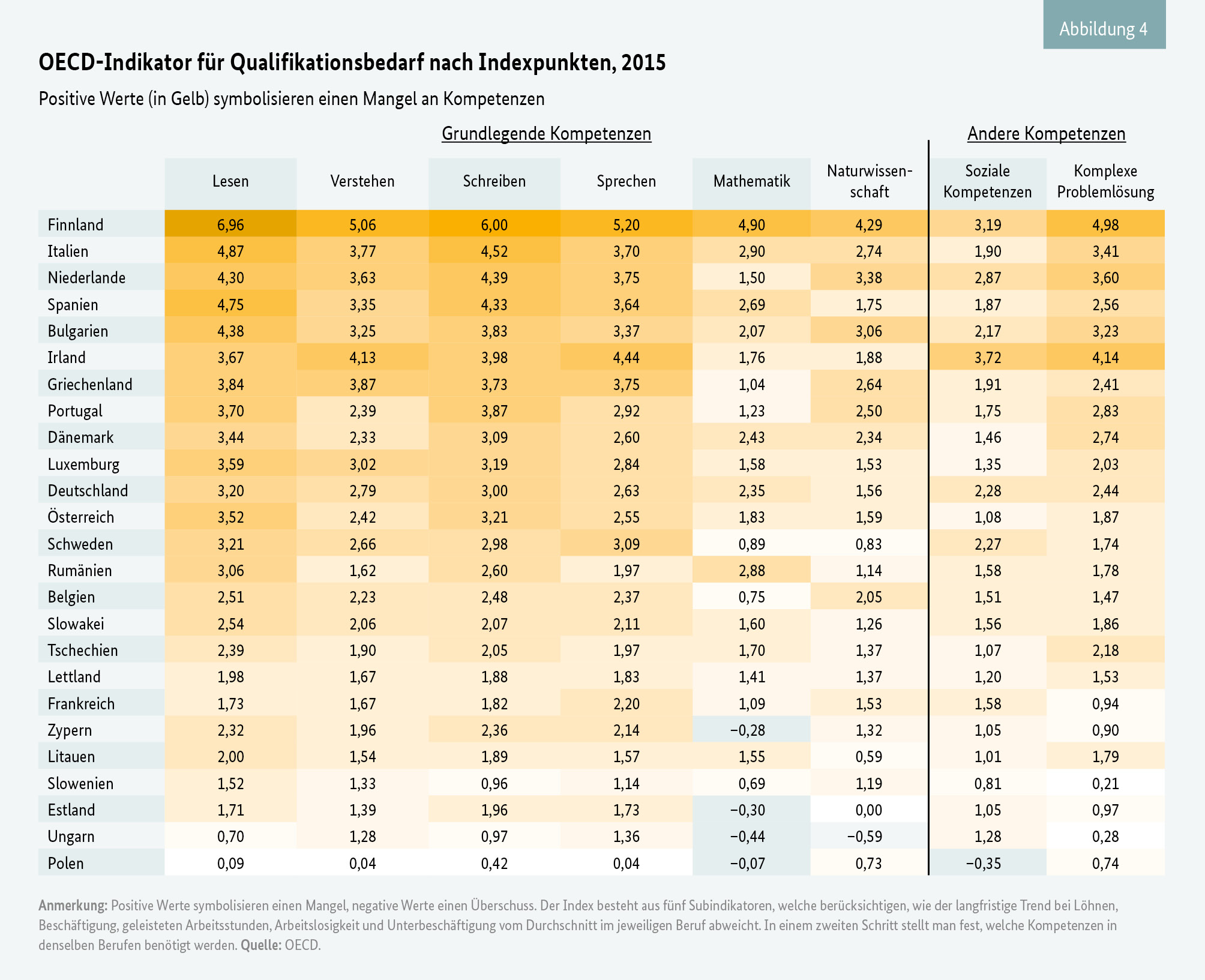 - Zu den angeführten vertikalen kommen horizontale Passungsprobleme hinzu. Laut OECD sehen sich ein Drittel der Arbeitskräfte mit dem Problem konfrontiert, dass das Studienfach ihres höchsten erreichten Abschlusses nicht zu der ausgeübten Tätigkeit im Beruf passt.6 Dies scheint bei tertiär Gebildeten ein besonderes Problem zu sein. Man weiß heute, dass berufsbezogene Elemente als Teil des Studiums dieses Risiko erheblich senken. Es gibt nachweislich einen substanziellen Mangel an Fachkräften, der weit über formale Qualifikationen hinausgeht. Unternehmen haben Mühe, Fachkräfte mit geeigneten Kompetenzen und Fähigkeiten zu finden. Fast in allen Mitgliedstaaten der EU gibt es einen Mangel an elementaren Kompetenzen, wie z. B. Lesen, Schreiben, Rechnen, aber auch an naturwissenschaftlichen sowie kognitiven Fähigkeiten (Abbildung 4). Mehr als einer von fünf jungen Europäer*innen hat im Rahmen der PISA-Studie der OECD aus dem Jahr 2018 diesbezüglich schwache Leistungen erbracht. Dabei gilt es als erwiesen, dass diese Gruppe oft auch im späteren Erwerbsleben mit großen Herausforderungen konfrontiert ist, weil die jeweiligen Kompetenzen den Anforderungen am Arbeitsmarkt nicht gerecht werden. Denn für die Ausübung einer beruflichen Tätigkeit ist im Allgemeinen ein Mindestniveau an notwendigen Kompetenzen gefordert („Employability Threshold“). Da insbesondere durch die fortschreitende Digitalisierung immer neue Anforderungen an die Kompetenzen und Qualifikationen der Arbeitskräfte gestellt werden, ist dieses Mindestniveau zusätzlich sehr dynamisch. Zahlreiche Europäer*-innen besitzen nicht ausreichend Kompetenzen, um dieses Niveau zu erreichen.