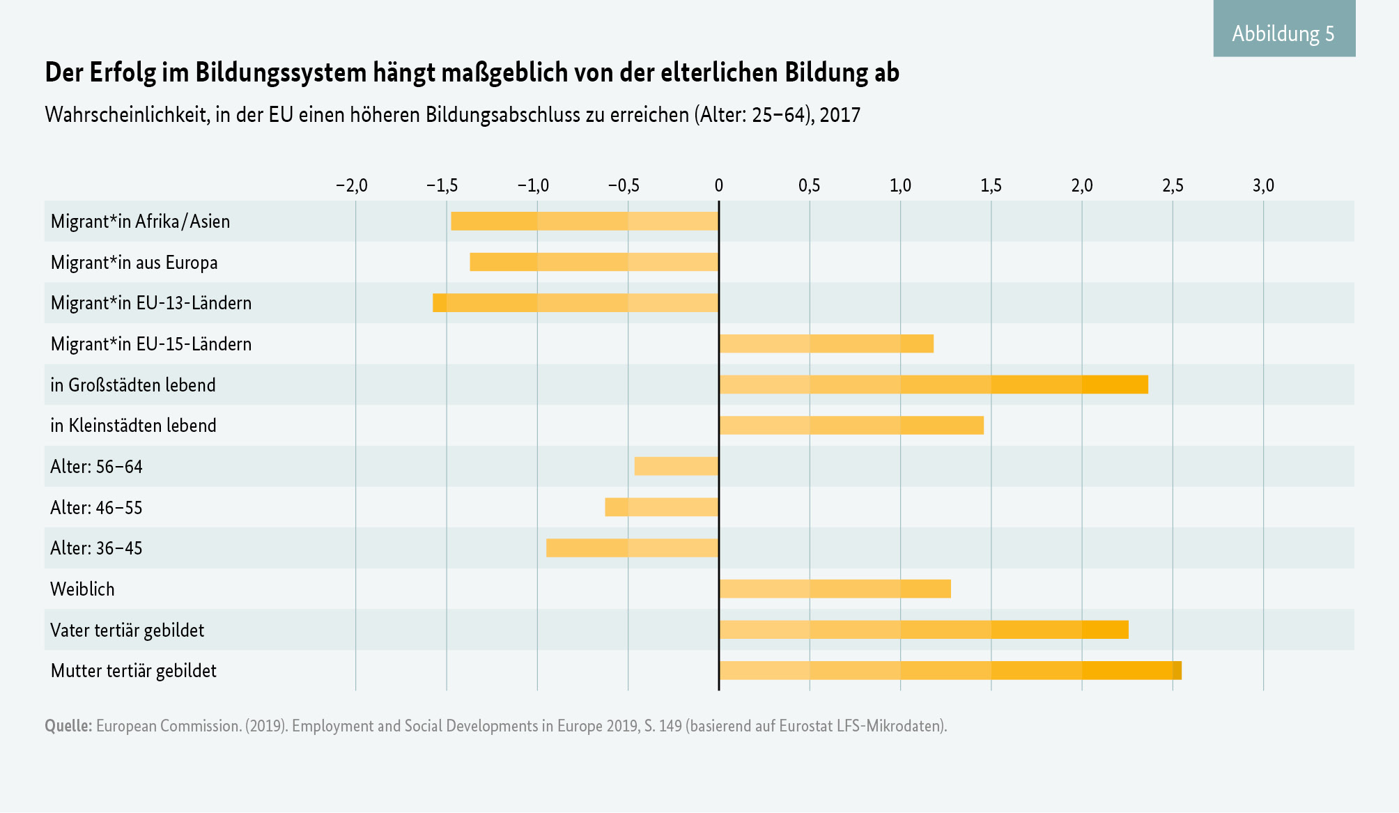- Soziale Benachteiligung führt zu einem Mangel an Fachkräften. Der starke Einfluss des sozioökonomischen Hintergrunds von Eltern auf die Bildung und Kompetenzen ihrer Kinder ist vor dem Hintergrund der Chancengleichheit eine Herausforderung. Vielfach können Qualifikationen und Talente nicht erworben werden, weil Menschen wegen sozialer Benachteiligung de facto von deren Erwerb ausgeschlossen sind. Die Chancen auf einen tertiären Bildungsabschluss sind für Personen mit einem tertiär gebildeten Elternteil mehr als doppelt so hoch, verglichen mit Personen, deren Eltern nur gering gebildet sind. Dies gilt auch dann, wenn man rechnerisch den Einfluss wichtiger anderer Faktoren, die ebenfalls Einfluss auf die Bildung haben (z. B. den Migrationsstatus), ausklammert (Abbildung 5). Bei Weitem ist soziale Benachteiligung aber nicht nur ein Problem von Menschen mit Migrationshintergrund. Soziale Benachteiligung hat die Tendenz, über die Bildung hinaus fortzubestehen: Oft bleiben Nachteile am Arbeitsmarkt auch dann bestehen, wenn trotz aller Widerstände das Bildungssystem erfolgreich durchlaufen wurde.7