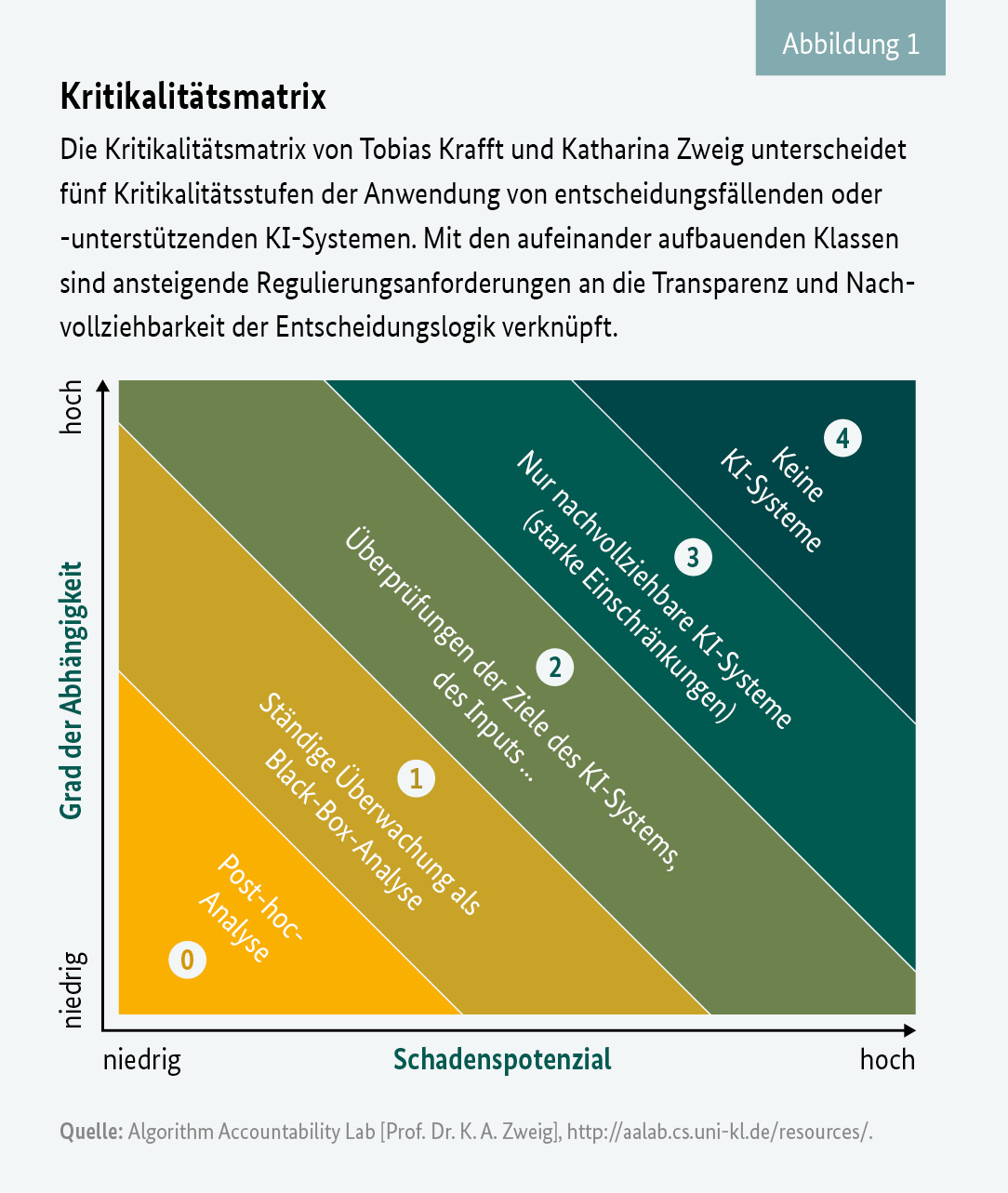 Zweig: Die brauchen auf der einen Seite die genannten Fachleute. Vor allen Dingen brauchen sie aber je nachdem, wie hoch das Schadenspotenzial eines solchen Systems ist, Zugang zu Daten und zu Schnittstellen, um nachvollziehen zu können, was genau passiert und ob beispielsweise diskriminiert wird. Deswegen haben wir einen Regulierungsvorschlag gemacht, der anhand von Schadenspotenzial und Grad der Abhängigkeit von einer Entscheidung verschiedene Transparenz- und Nachvollziehbarkeitspflichten aufteilt (Abbildung 1).