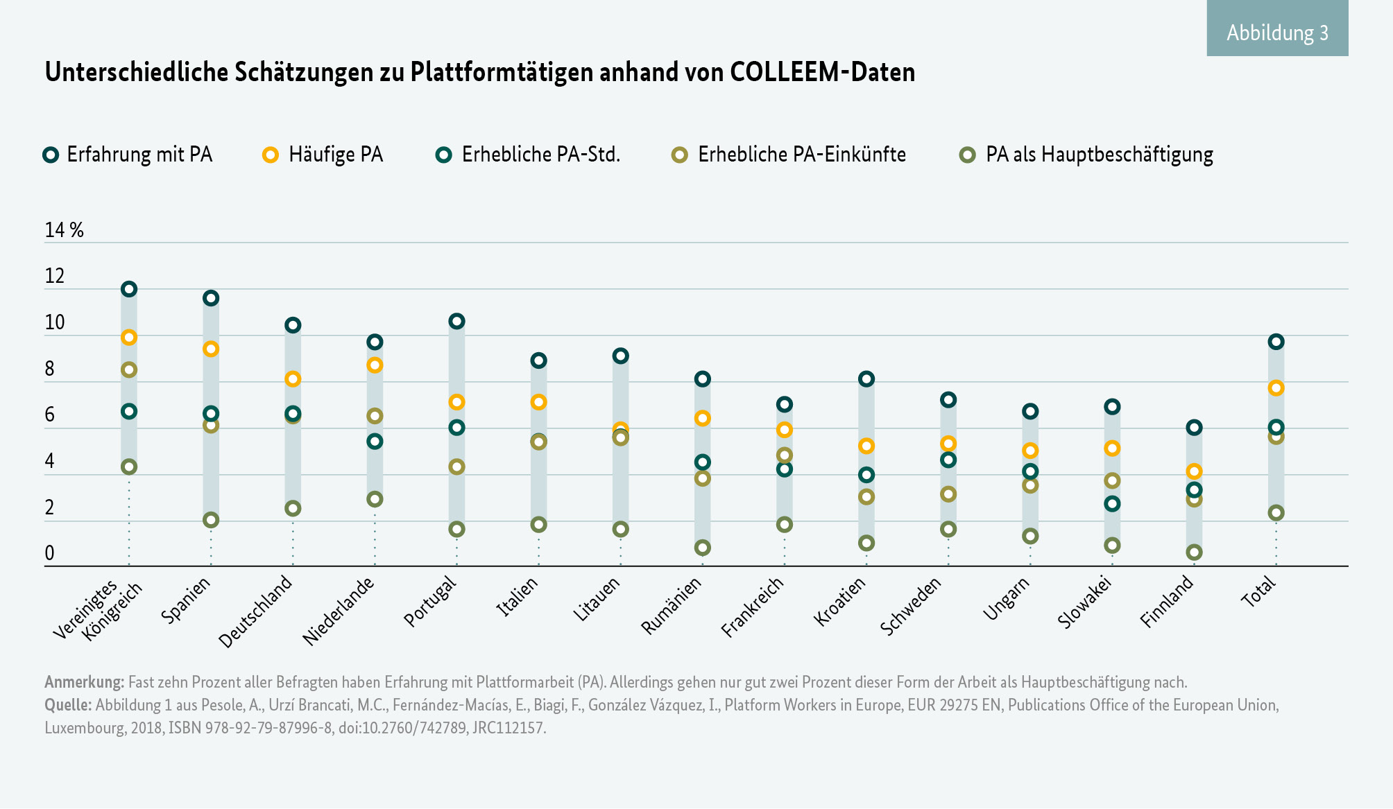 Die Bedeutung von Plattformarbeit gemessen an der Verbreitung ist derzeit noch Teil der Forschung. Im Jahr 2017 führte die Joint Research Group (JRC) der EU-Kommission eine europaweite Befragung zur Verbreitung von Plattformarbeit durch. Insgesamt 32.409 Personen aus 14 Mitgliedstaaten der Europäischen Union nahmen an der Online-Befragung, die sich an Internetnutzer*innen richtete, teil. Abbildung 3 präsentiert unterschiedliche Messgrößen der Verbreitung von Plattformarbeit. Grundlegend geben etwa zehn Prozent der Befragten an, jemals Plattformarbeit angeboten zu haben. Über die einzelnen Länder hinweg variiert dieser Anteil zwischen sechs und zwölf Prozent. Die Aufnahme von Plattformarbeit ist zumindest für den Bereich der Online-Arbeit mit keinen großen Anforderungen verbunden. Daher ist weiter zu untersuchen, in welchem Maß die genannte Plattformarbeit einen bedeutenden Teil der Erwerbstätigkeit der Befragten einnimmt. Gemessen an der Zahl der Stunden und der Einkommenshöhe nimmt die Plattformarbeit nur bei einem Teil der Plattformarbeitenden eine bedeutendere Rolle ein. Insgesamt weniger als sechs Prozent der Befragten verbringen mindestens ein Viertel einer 40-StundenWoche mit Plattformarbeit, und ebenfalls knapp sechs Prozent verdienen mit Plattformarbeit mindestens ein Viertel ihres Erwerbseinkommens. Letztlich geben etwa zwei Prozent der Befragten an, dass Plattformarbeit die hauptsächliche Quelle ihres Erwerbseinkommens darstellt.