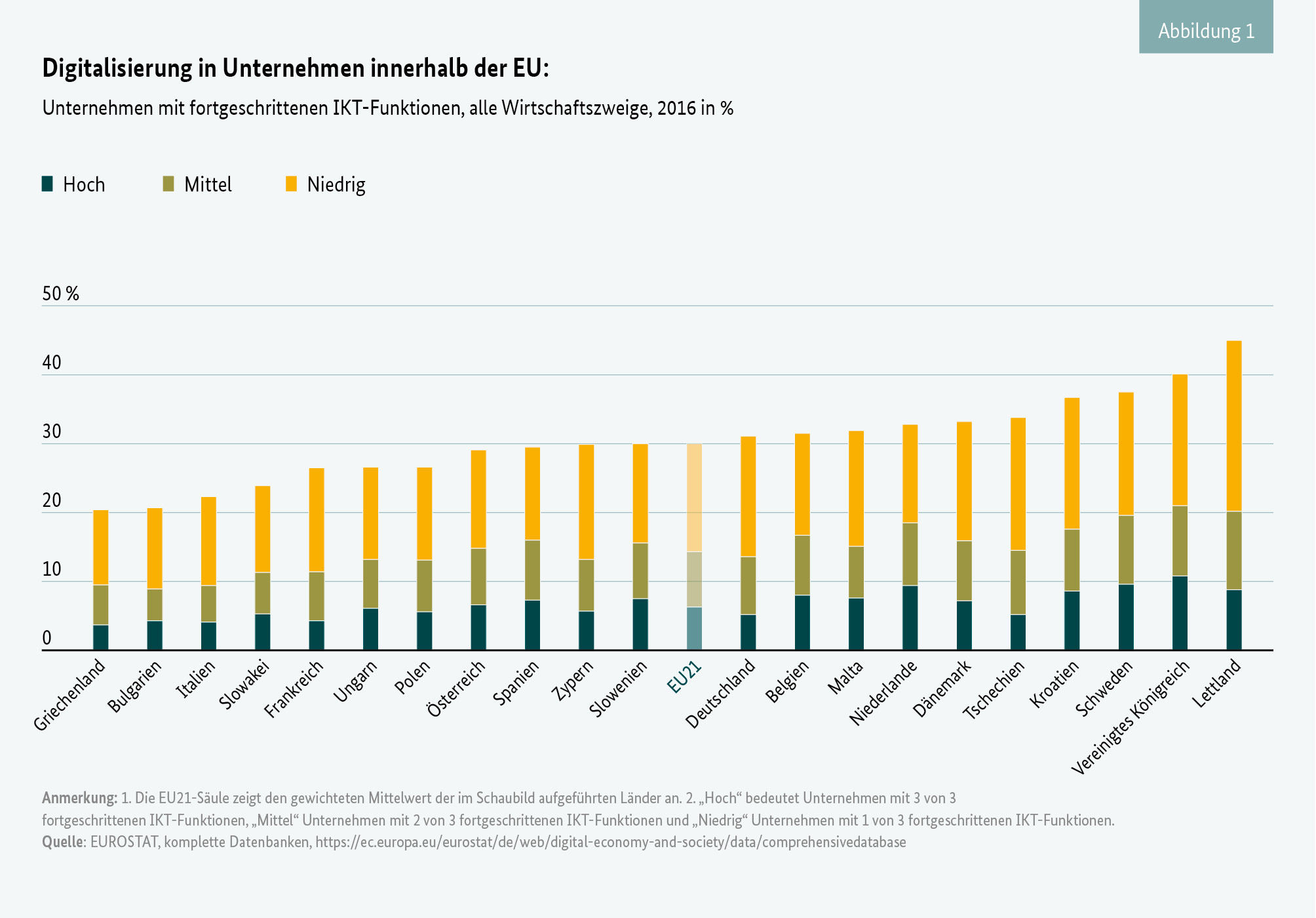 Abbildung 1: Im Schnitt haben EU-weit 30 Prozent der Unternehmen fortgeschrittene IKT-Funktionen (z. B. Aktivitäten im Bereich IT-Sicherheit und Datenschutz, maßgeschneiderte Unternehmenssoftware sowie die Entwicklung von Weblösungen) eingerichtet. Allerdings finden sich in nur 6,3 Prozent der Unternehmen „hoch“ fortgeschrittene IKT-Funktionen.