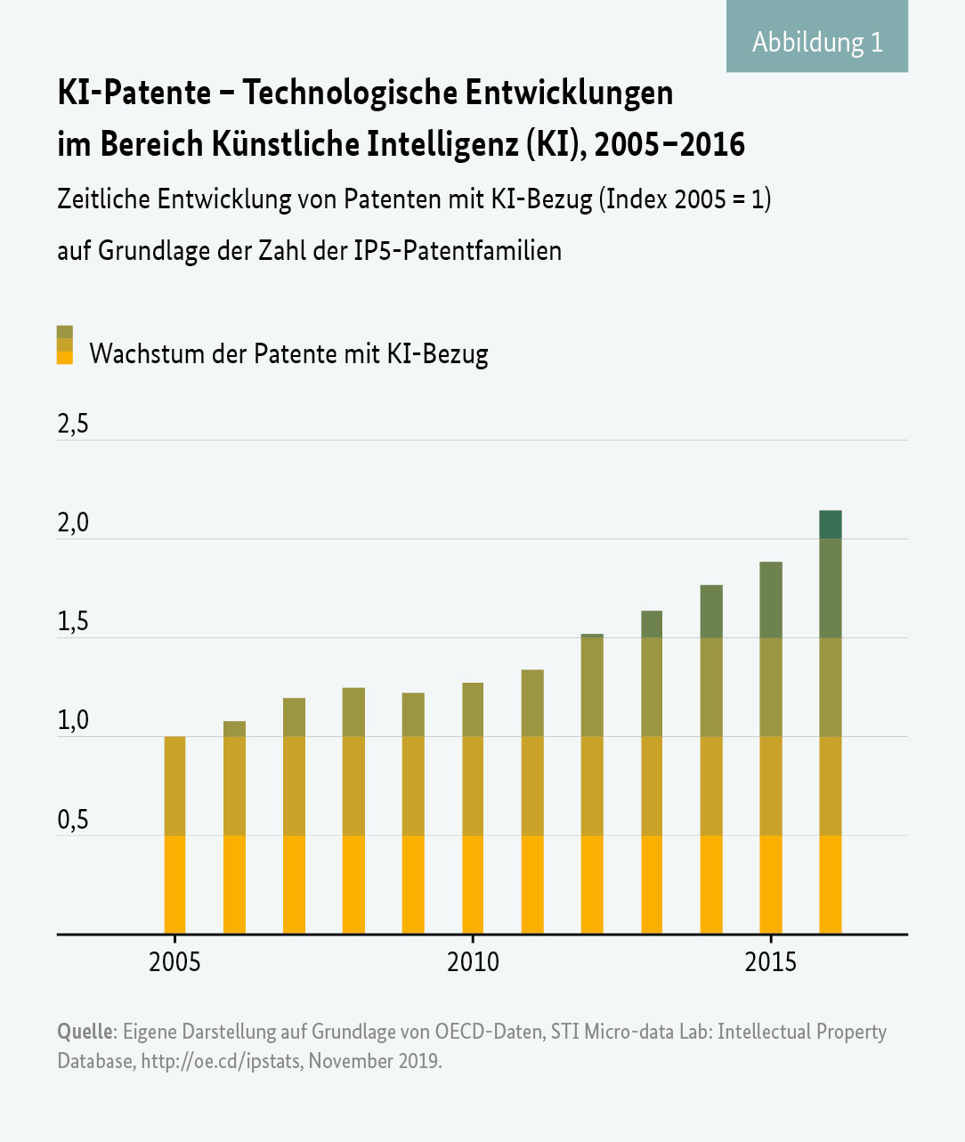 Abbildung 1: Die Zahl der Patente mit KI-Bezug ist zwischen 2005 und 2017 um durchschnittlich 7,8 Prozent pro Jahr gestiegen. Dieser Zuwachs ist ein Hinweis auf die zunehmende Bedeutung der Künstlichen Intelligenz.