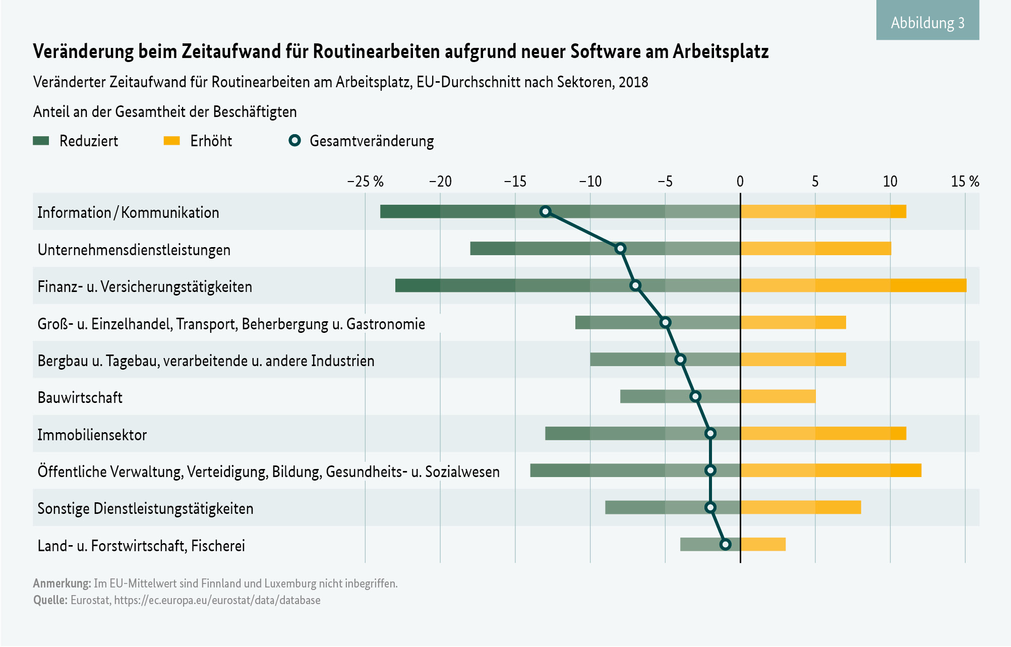 Abbildung 3: Technologien können die Qualität von Arbeitsplätzen auch positiv beeinflussen. Im Durchschnitt der betrachteten 26 EU-Länder übersteigt die Zahl der Personen, die sagen, dass die Einführung neuer Software am Arbeitsplatz die im Schnitt mit Routinearbeiten verbrachte Zeit verringern konnte, die Zahl derjenigen, die angeben, dass sich die mit Routinearbeiten verbrachte Zeit erhöht hat. Dies gilt für alle Branchen, auch wenn die Wirkung im Informations- und Kommunikationssektor am größten ist.
