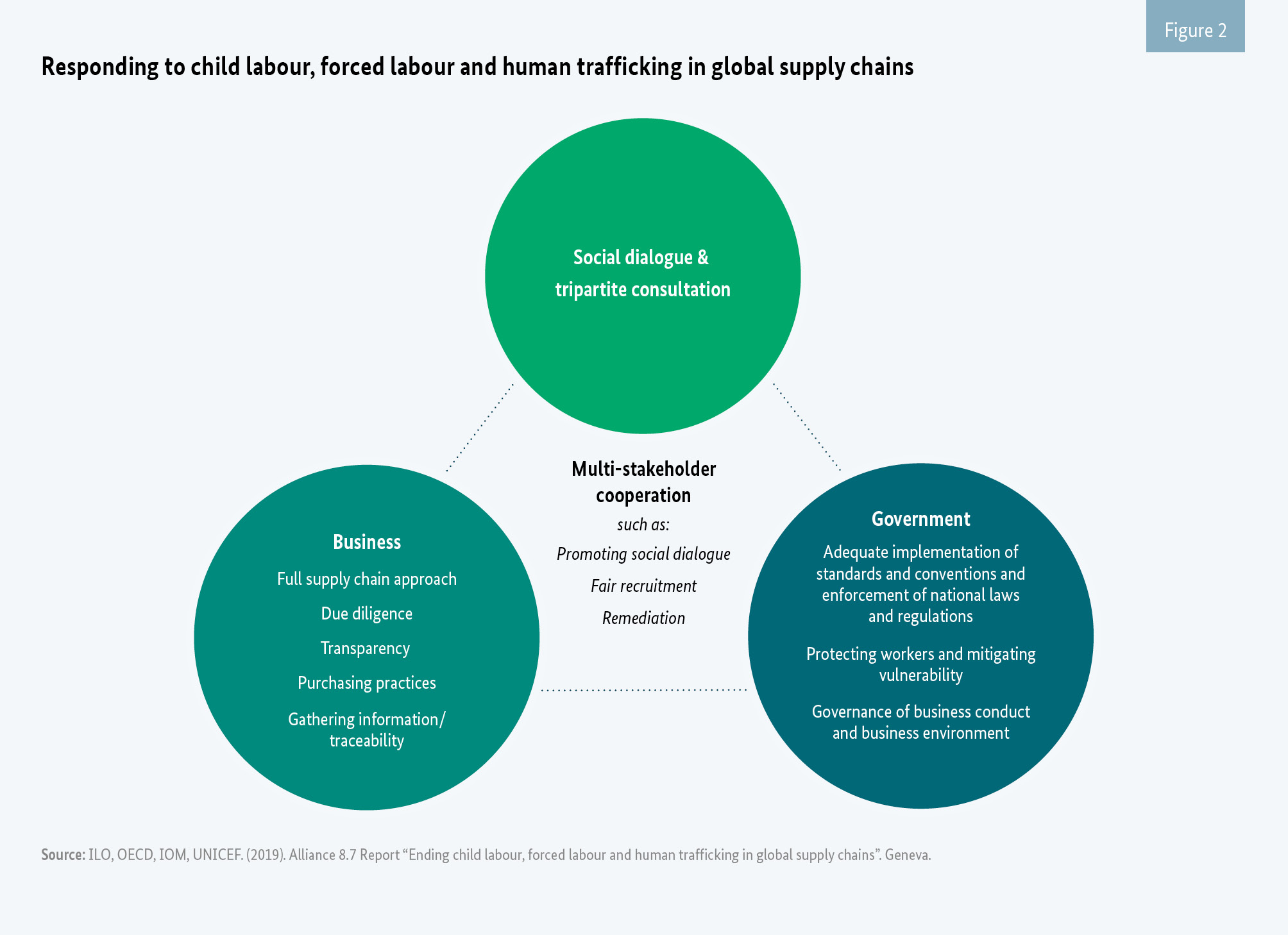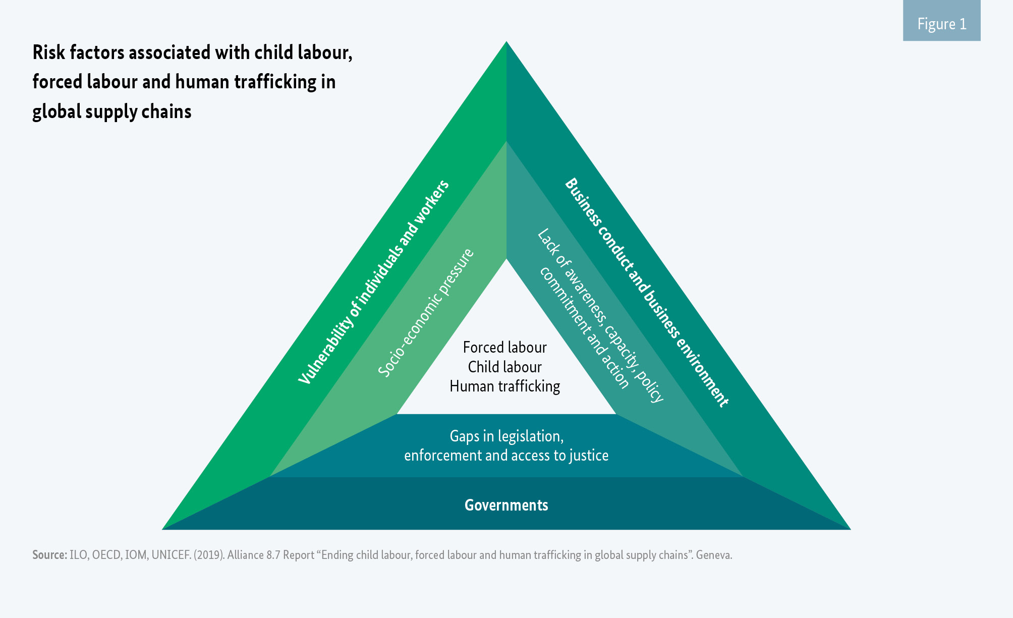 The Alliance 8.7 Report identified a number of risk factors which are important for the development of policies by governments as well as private and public enterprises. For example, in countries that insufficiently or inconsistently implement and enforce international standards pertaining to the prohibition of child labour, human trafficking and forced labour, enterprises will be faced with a permissive culture of certain exploitative practices. Private compliance initiatives can partially mitigate this risk, but they are no substitute for effective statutory regulation and enforcement. Another structural risk factor pertains to socio-economic pressures which require comprehensive government responses, such as the extension of social protection floors and access to finance for small producers. Finally, risk factors are also directly related to the business environment and the extent to which responsible business conduct is being promoted in a particular country and sector. This requires strong social dialogue and collective bargaining mechanisms to mitigate undue competitive pressure.