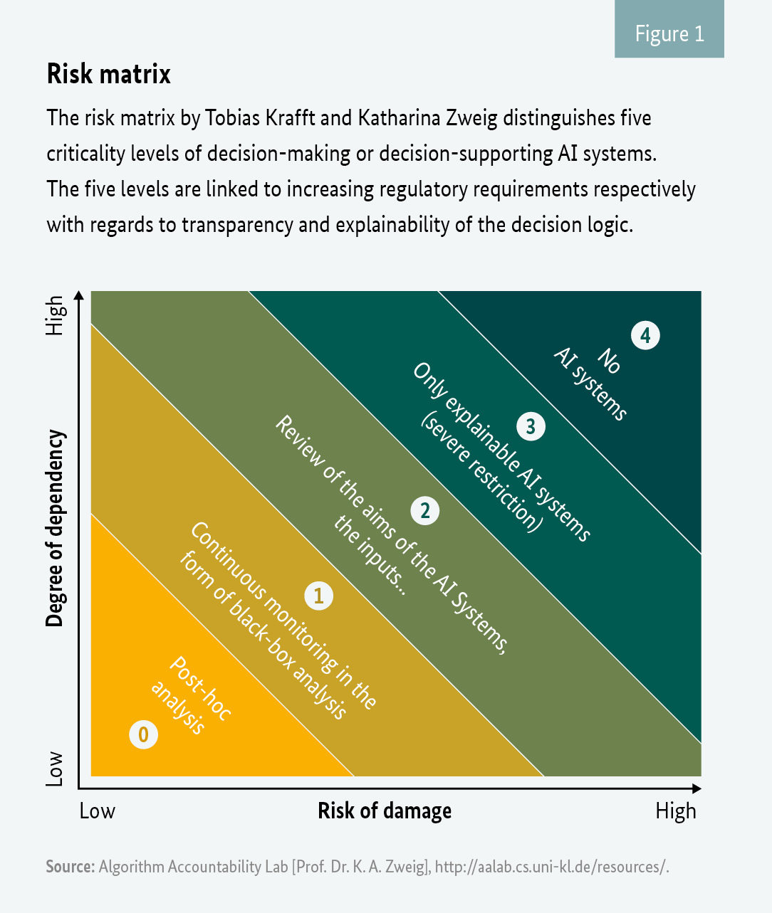 Zweig: On the one hand, they need the specialists I mentioned. Above all, though, they need – depending on how great the system’s potential for harm is – access to data and interfaces which enable them to understand exactly what is happening and whether, for example, discrimination is taking place. That is why we have proposed regulation which establishes various transparency and explainability obligations based on the potential for harm and the degree of dependence on a decision. (Figure 1)