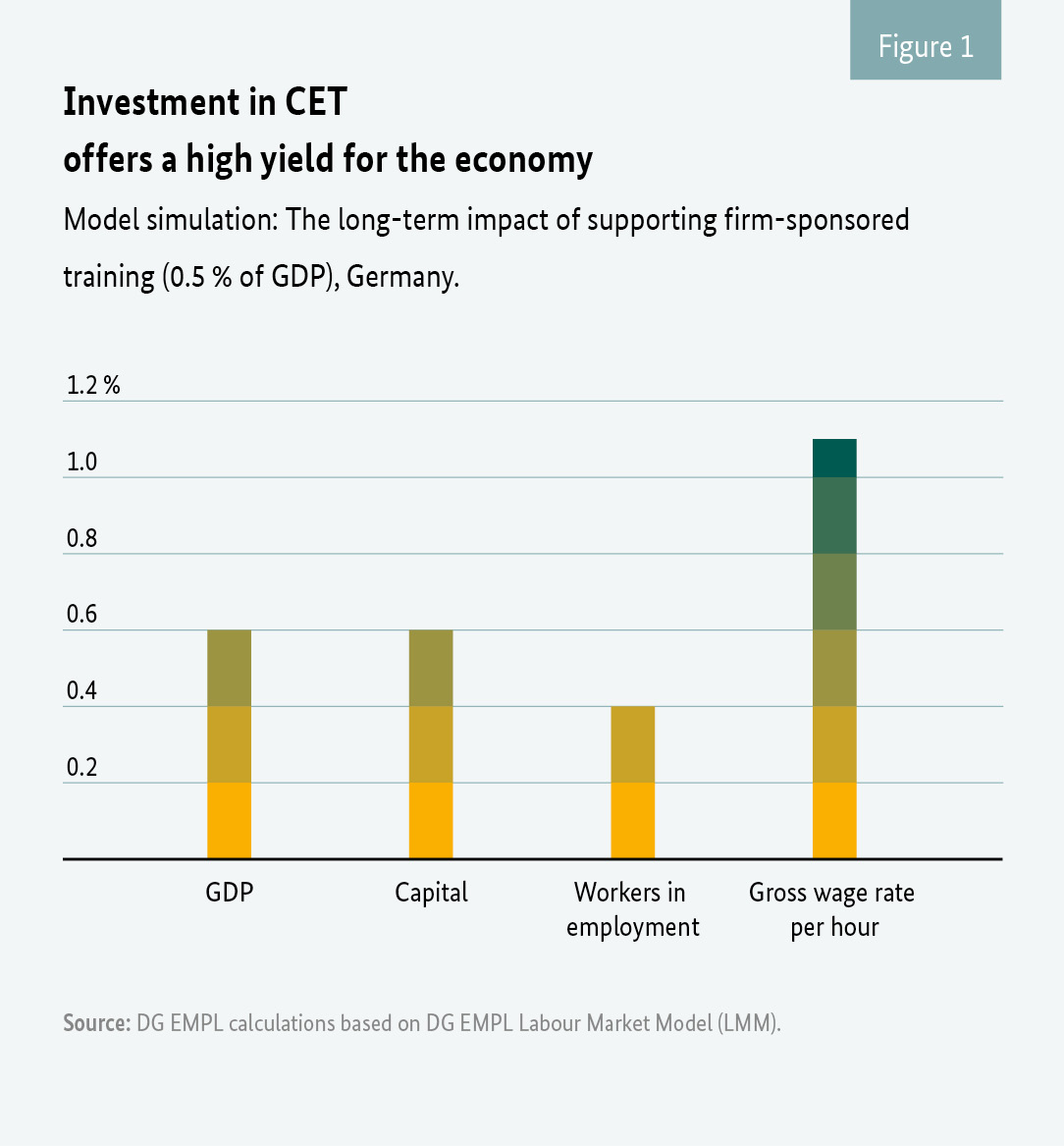 - From an economic perspective through higher productivity and higher GDP. For instance, simulation results for Germany show that improving workers’ employability through firm subsidies that incentivise the provision of training at the workplace yields high returns from a macroeconomic perspective, including increases in employment, GDP, capital investments and wage rates. The increased training enhances workers’ skills and their productivity, leading to higher labour demand, employment and hours worked. Wages go up significantly, rewarding workers for their higher productivity (Figure 1).