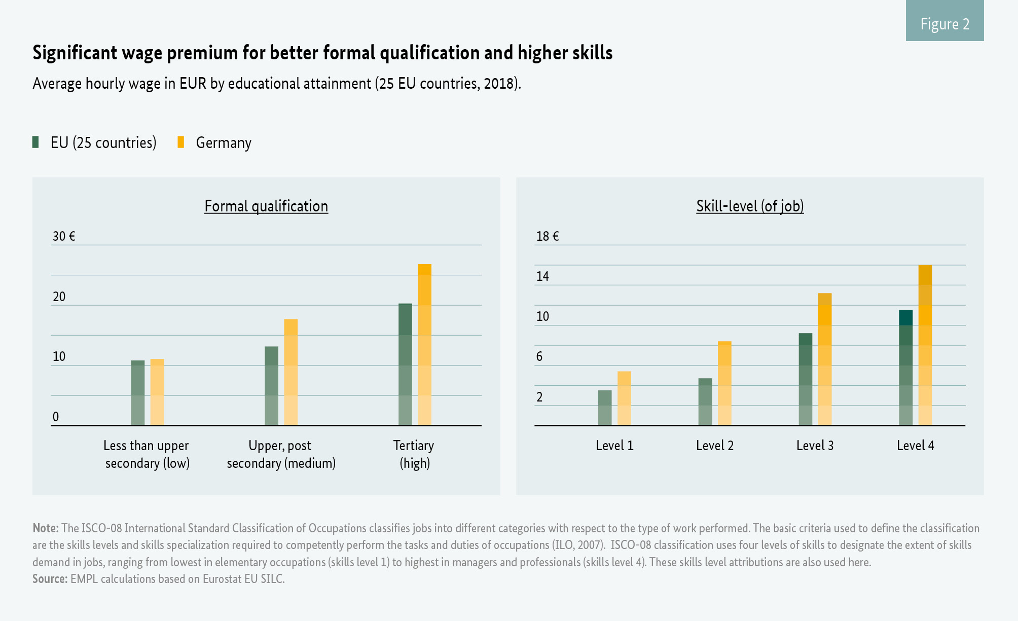 - From an individual perspective through higher returns to skills and education (Figure 2). In 2018, the average hourly wage for highly qualified workers in the EU was twice as high as for their low-qualified colleagues. Likewise, when it comes to the level of skills required on the job,3 workers on elementary jobs (level 1) earn a third of what managers and professionals (level 4). The respective premiums are particularly pronounced in Germany.