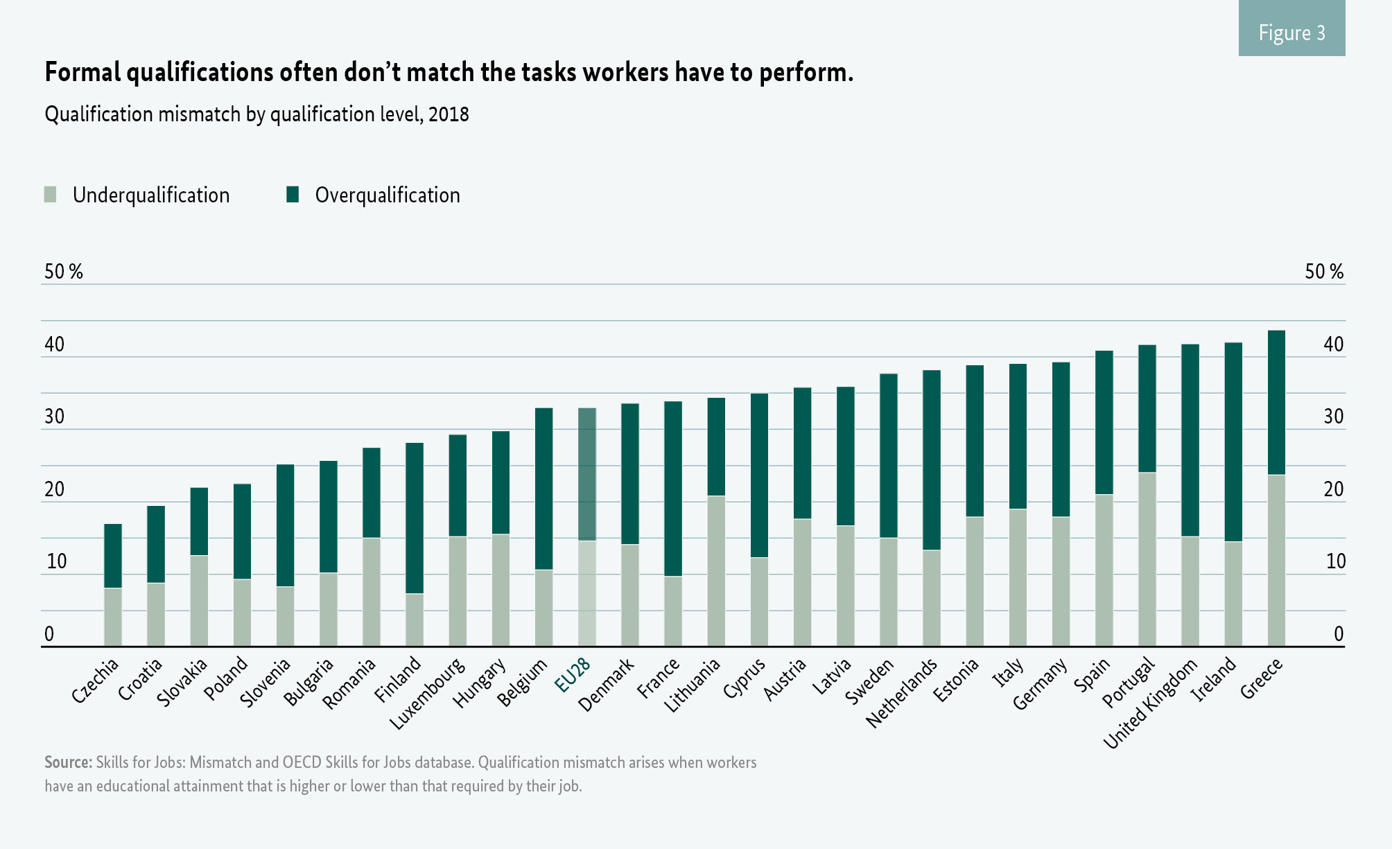 - Qualification mismatches weigh heavily on growth. Several education-related indicators have improved during the last decade. The proportion of early school leavers stands at 10 per cent in the EU, down from almost 14 per cent in 2010. Over the same period, the proportion of 30 to 34 year-olds holding tertiary degrees has increased from 33 per cent to 40 per cent. Women in particular have improved their educational attainment significantly.The main problem with formal qualifications in the labour market is not their level. It is the fact that workers’ qualifications often do not match the tasks they have to perform. According to the Organisation for Economic Co-operation and Development (OECD), about one-third of EU workers between 15 and 64 are either over- or under-qualified in the sense that their formal qualification is higher or lower than that most commonly observed in their occupation (Figure 3).4