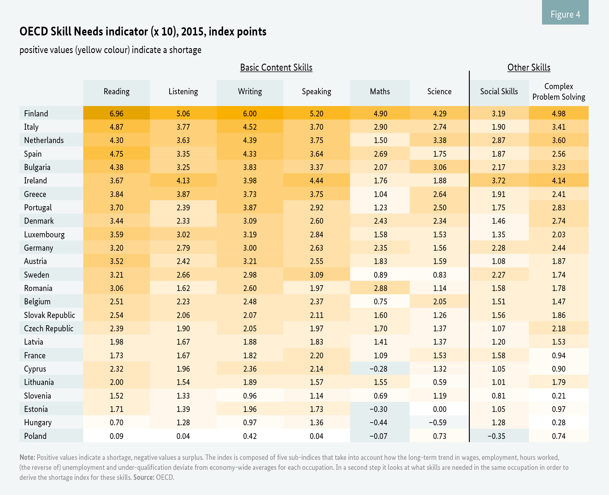 - In addition to these vertical mismatches, the OECD reckons that around one-third of workers in the EU face the problem that the field of study (of their highest education obtained) is not appropriate for their occupation.7 This seems to be a particular problem especially for tertiary education. There is evidence that vocational elements as part of the study reduces that risk substantially. There is a substantial skill shortage – going well beyond formal education levels. Firms struggle to find workers with the right competencies. Almost all EU Member States face serious shortages in basic skills such as reading and writing, elementary maths, sciences and cognitive skills (Figure 4).