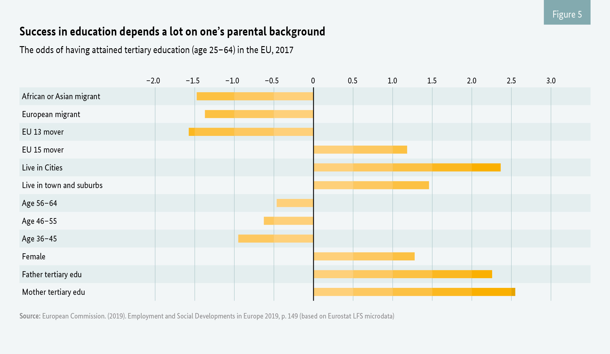 - Social disadvantage is a major reason for skill shortages. The impact of parental background on education and skills outcomes is a major concern from the perspective of equal opportunities. A large proportion of potential skills and talent in the workforce is de facto excluded as a consequence of disadvantaged socio-economic background. If a person’s father or mother is tertiary-educated, this more than doubles her chance to attain tertiary education levels herself. This finding holds under “all other things being equal” conditions (Figure 5).