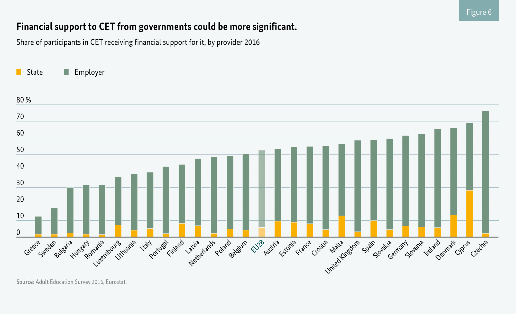 - While CET helps to mitigate these challenges, governments can do more to support training opportunities for workers. The effectiveness of CET is well documented (Figure 1 above). However, only half of the EU’s participants in training courses seem to receive financial support for that purpose. These contributions come from firms themselves rather than governments. In many Member States, financial support from the state is relatively low.