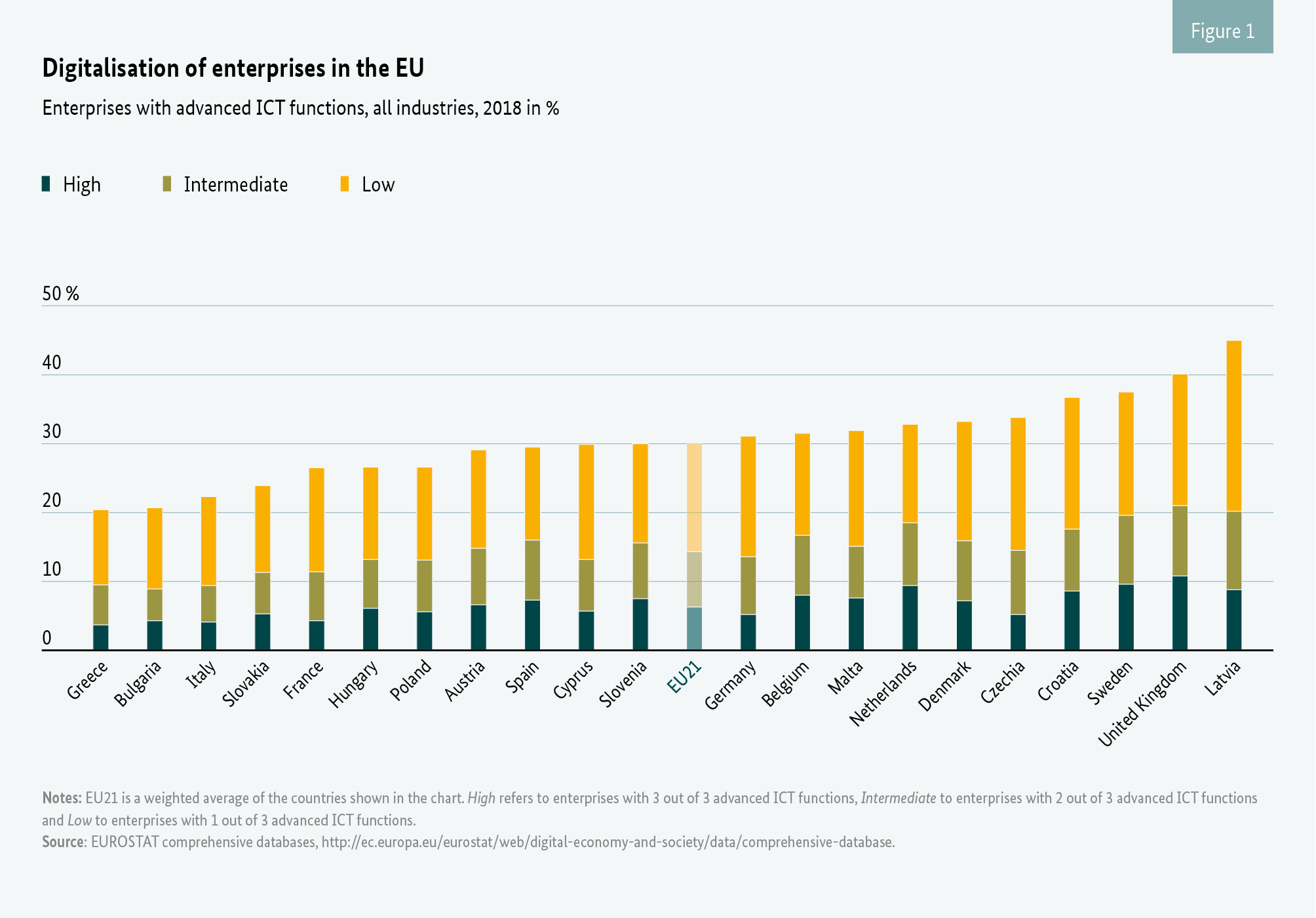Figure 1 The average share of enterprises with advanced ICT functions, (i.e.: ICT security and data protection activities, tailoring of business management software and the development of web solutions) is 30 per cent across EU countries. Only 6.3 per cent of enterprises, on average, have a “high” advanced ICT functions.