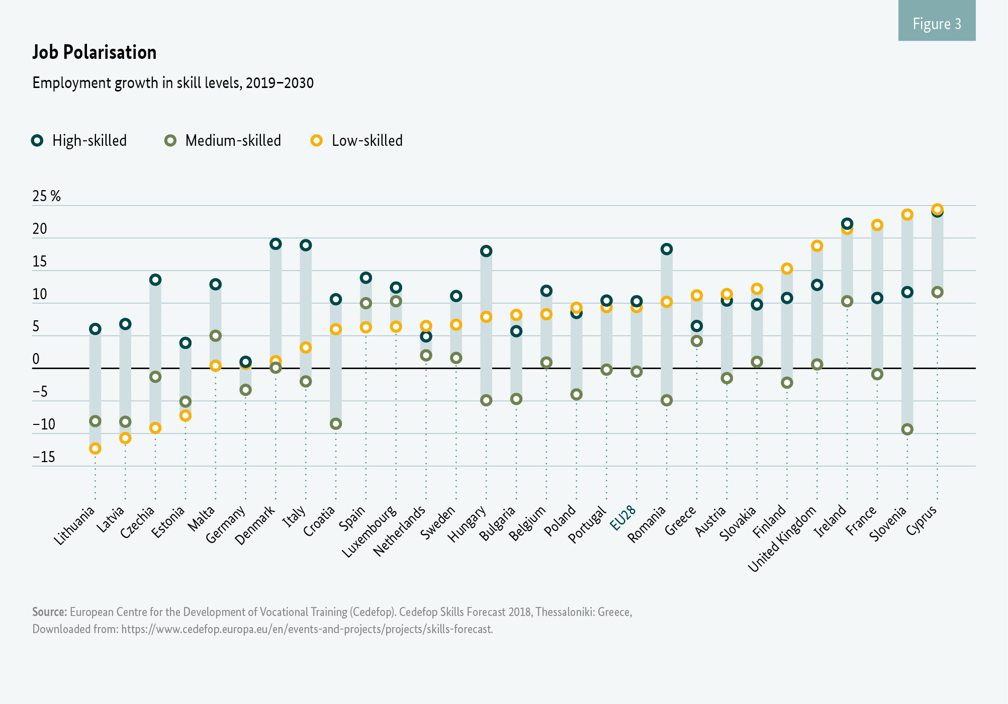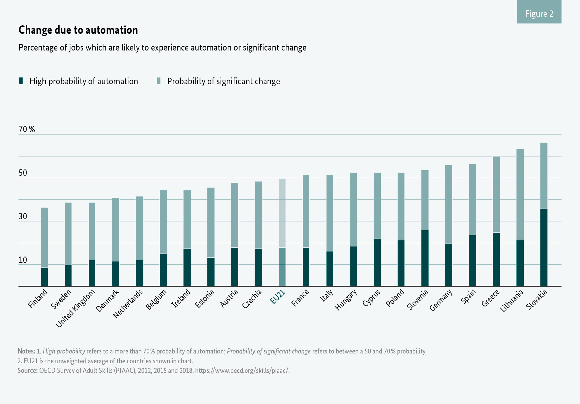 Figure 2 On average, around 50 per cent of jobs in EU countries with available data are likely to be significantly affected by automation over the next 10 20 years. 18 per cent of jobs are at highly likely to be affected by automation, and a further 32 per cent of jobs are likely to experience significant change.