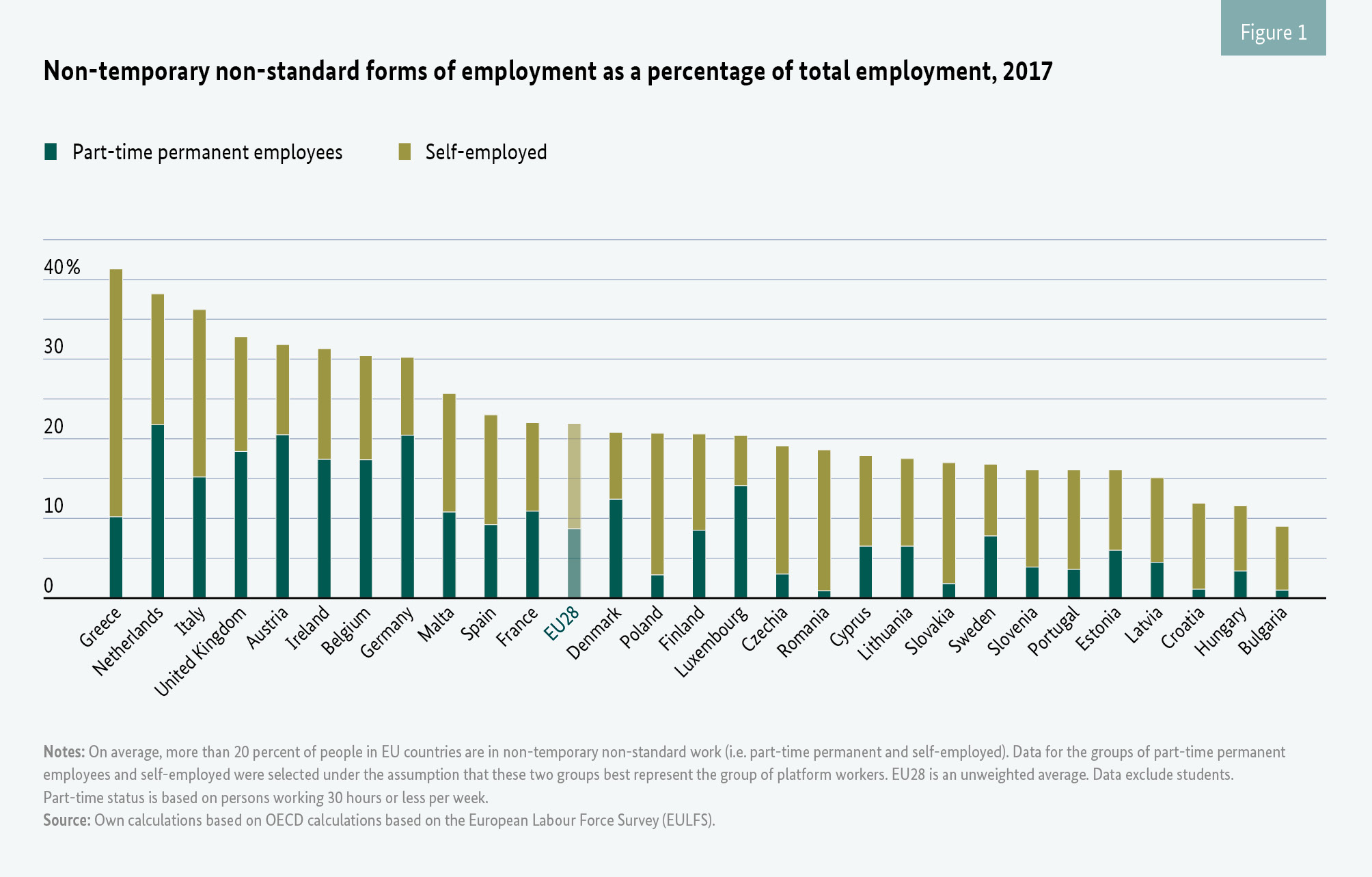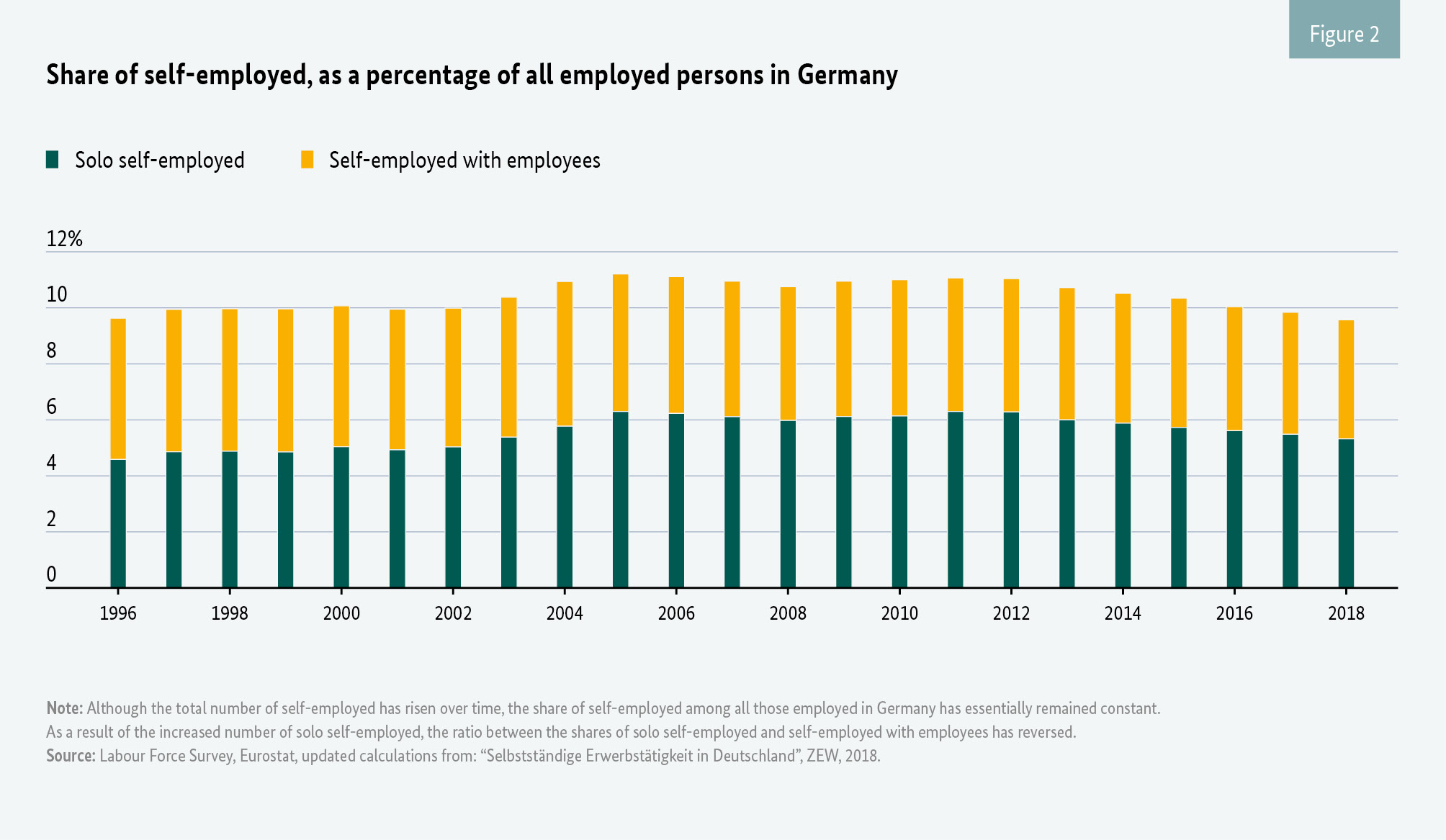 Issues concerning labour and social protection for solo self-employed when performing platform work are now being widely discussed at international level.9 Self-employment is a relevant factor in the world of work in countries across the European Union (Figure 1). This includes the German labour market (Figure 2).