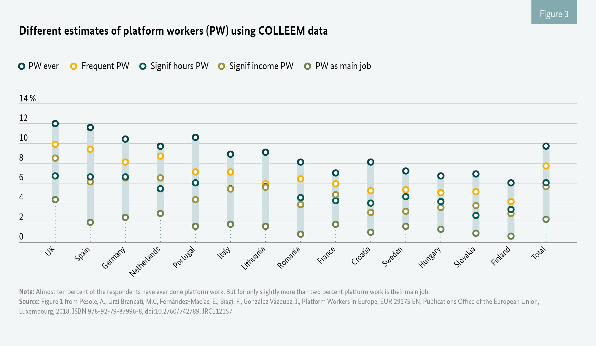 The importance of platform work in terms of its prevalence is still being researched. In 2017, the Joint Research Group (JRC) of the EU Commission conducted a Europe-wide survey on the prevalence of platform work. A total of 32,409 people from 14 EU Member States took part in the online survey which targeted internet users. Figure 3 presents different measures of the prevalence of platform work. About 10 per cent of respondents stated that they have offered platform work at some time or other. Across the various countries, the proportion varies between twelve and six per cent. When it comes to online work at least, taking up platform work is not subject to any major requirements. Further research is therefore needed to assess the extent to which such platform work makes up a significant part of the respondents’ employment. Measured by the number of hours and the income level, platform work only plays a more significant role for a relatively small number of platform workers. In total, less than six per cent of respondents spend at least one quarter of a 40-hour week on platform work and just under six per cent earn at least one quarter of their income from platform work. Finally, around two per cent of respondents say that platform work is their main source of income.